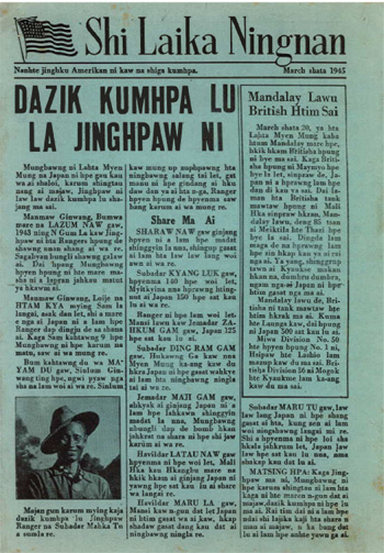 Otro de los periódicos leaflet editados por el OWI (Office of War Information), el departamento de guerra psicológica del US Army, sería Shi Laika Ningnan (El Nuevo Periódico), destinado a las belicosas poblaciones del norte de Birmania de origen kachin o jingpo. Con cuatro páginas por número, un formato medio y utilizando las lenguas locales, pero con alfabeto latino, este periódico leaflet, editado en la India, comenzó a ser diseminado en 1943 con periodicidad mensual, aunque no sabemos si la mantuvo regularmente. Los últimos ejemplares de esta publicación fueron impresos sobre un papel de tono azulado